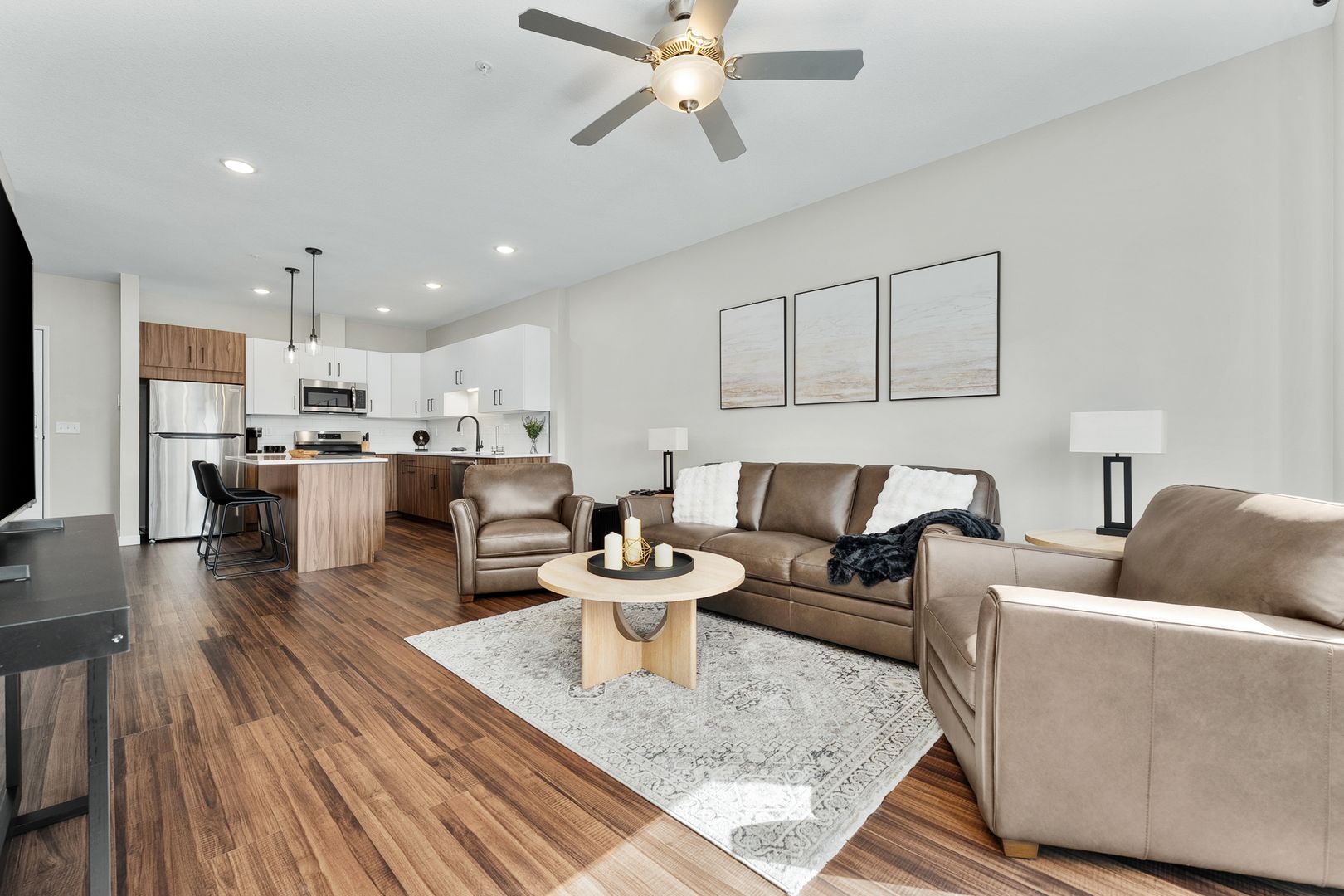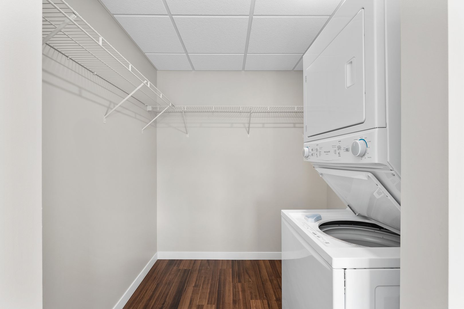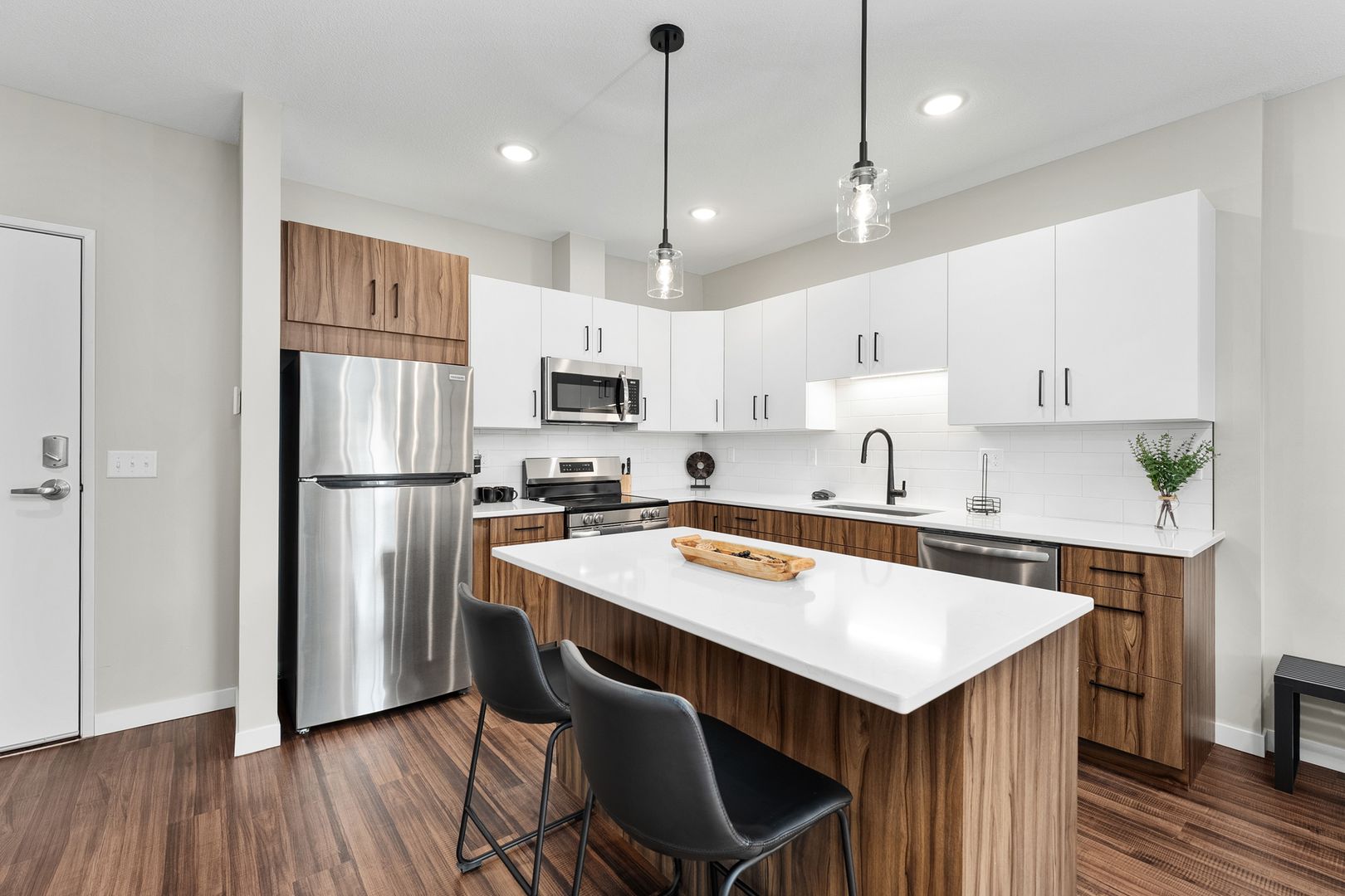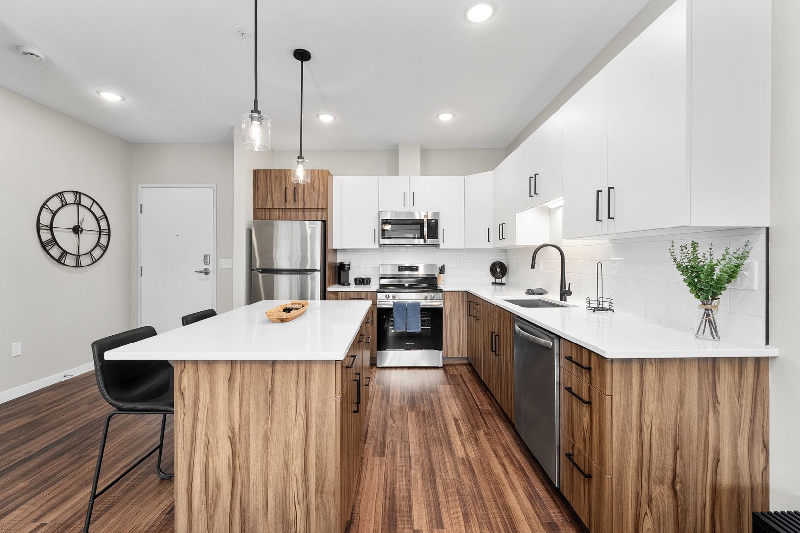 This one-bedroom apartment boasts a modern eat-in kitchen with energy-efficient stainless-steel appliances, quartz countertops, and a generous coat closet for extra storage. The unit also features elegant laminate wood flooring, contemporary fixtures, a convenient stackable washer and dryer, window coverings, ceiling fans, a spacious closet, and a private outdoor balcony.