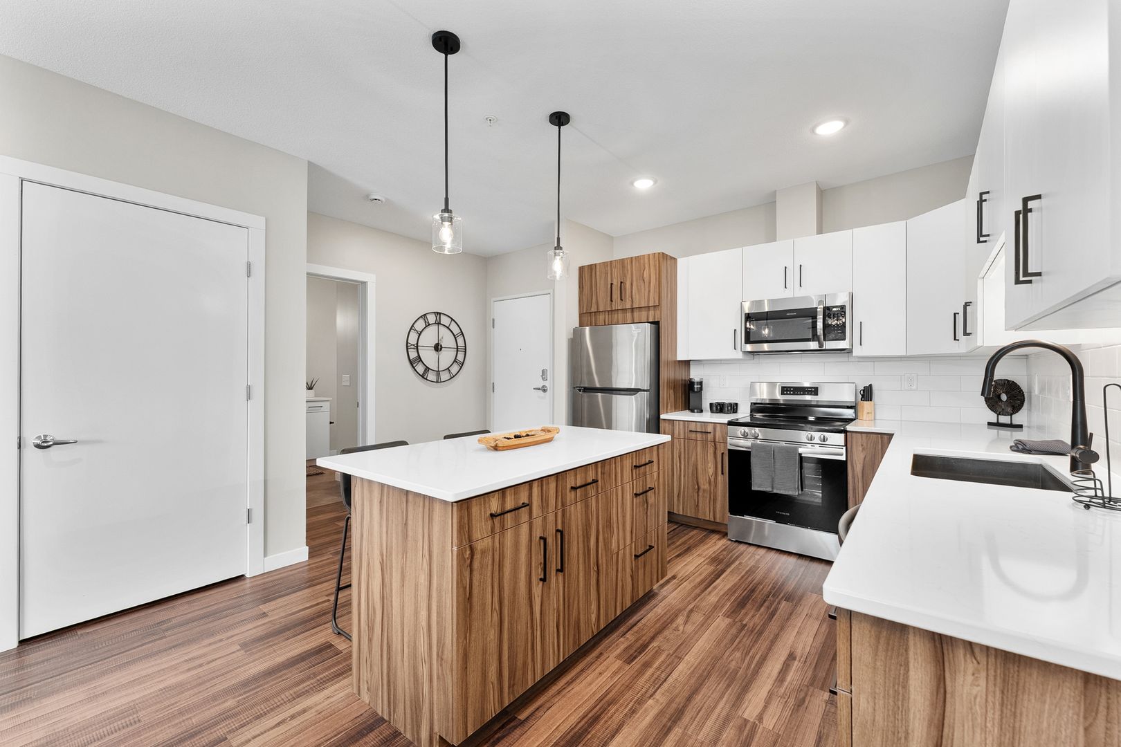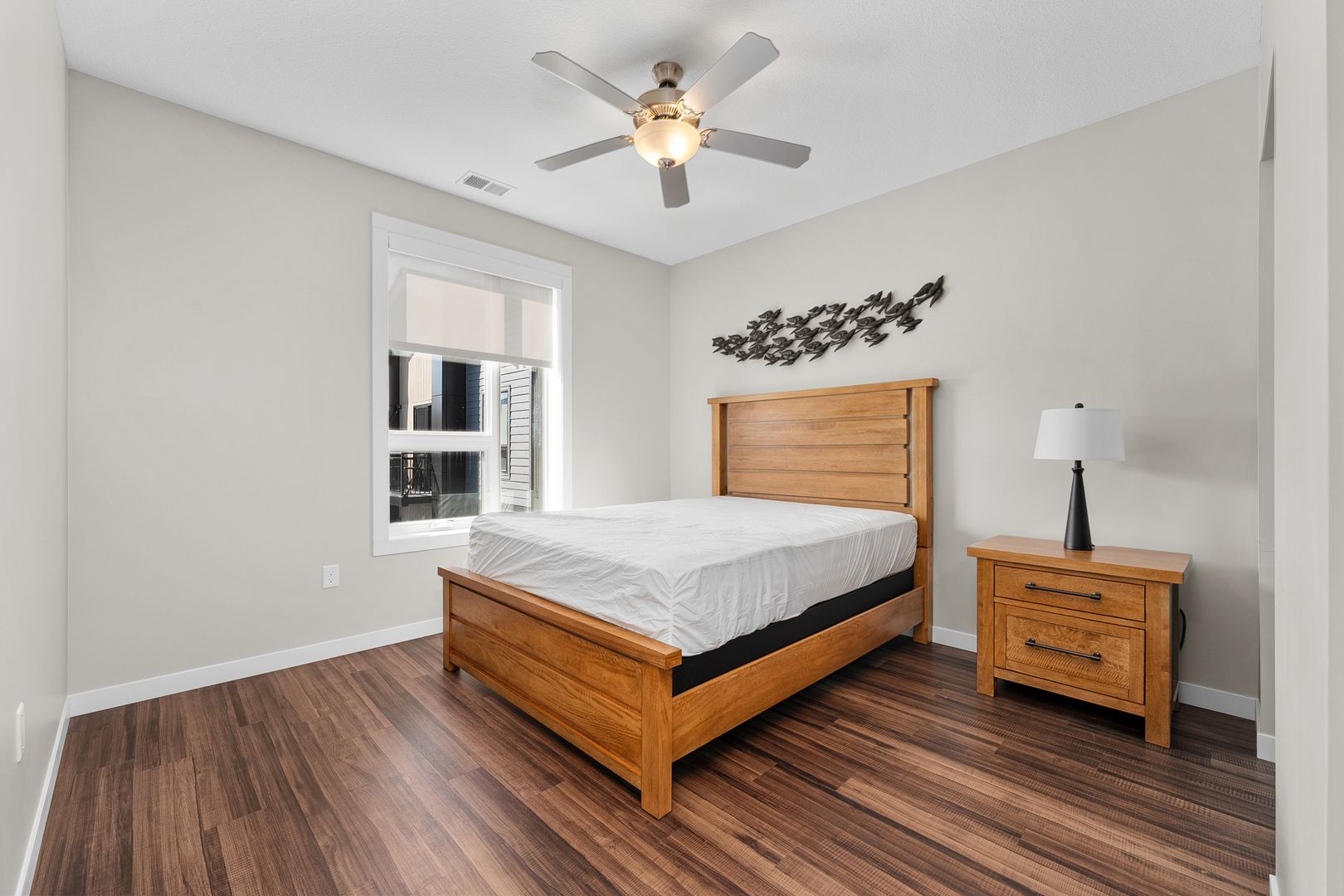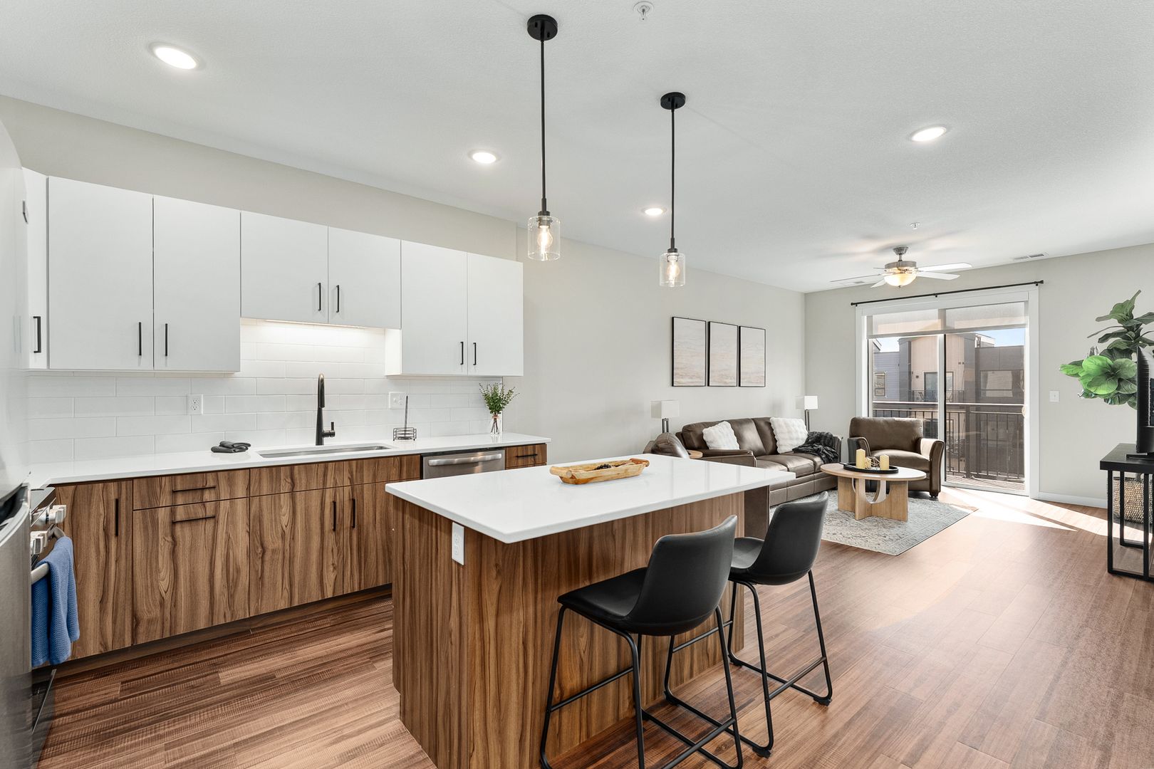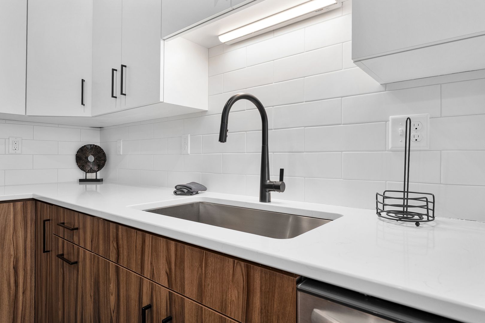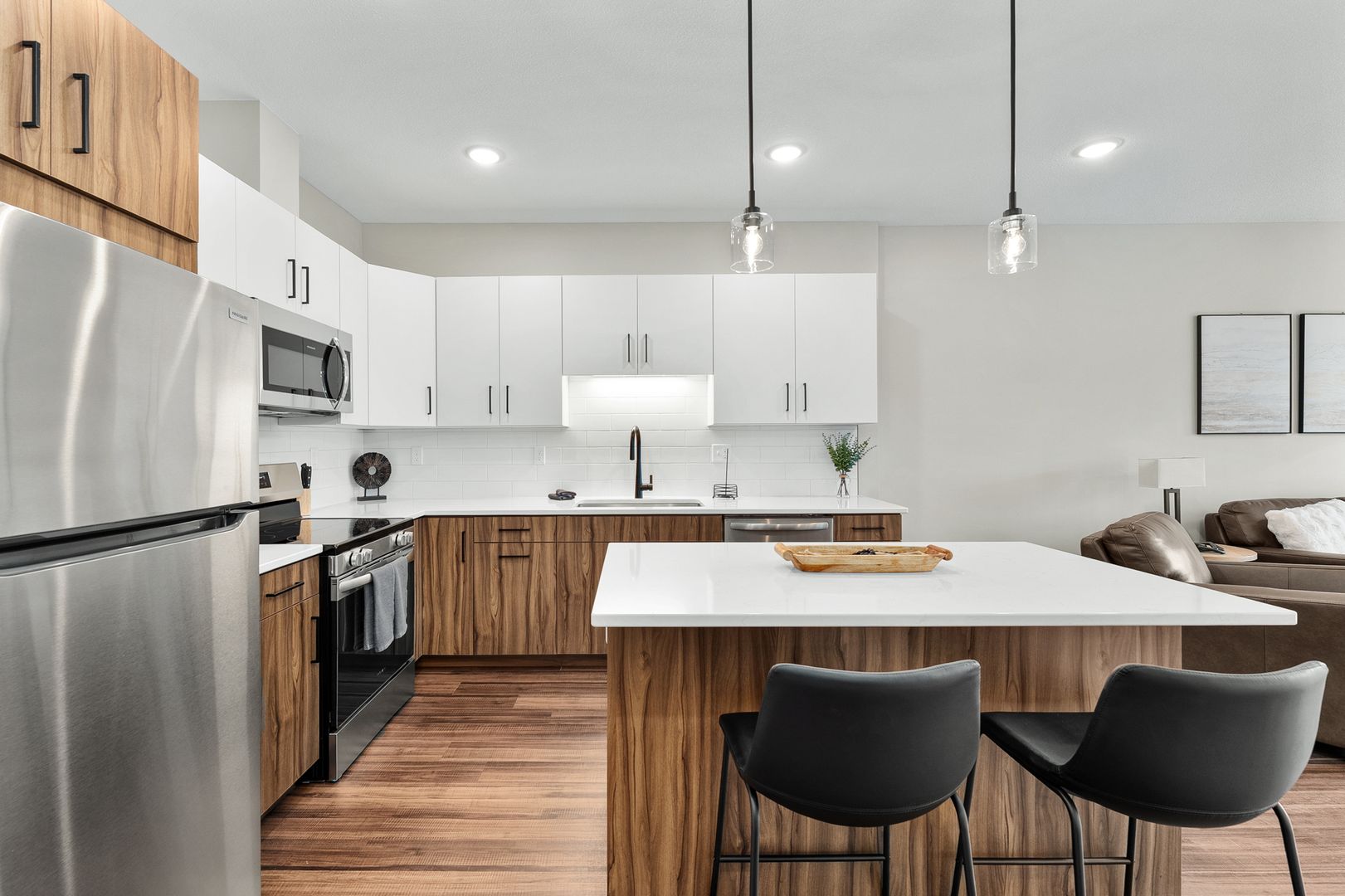 This one-bedroom apartment boasts a modern eat-in kitchen with energy-efficient stainless-steel appliances, quartz countertops, and a generous coat closet for extra storage. The unit also features elegant laminate wood flooring, contemporary fixtures, a convenient stackable washer and dryer, window coverings, ceiling fans, a spacious closet, and a private outdoor balcony.