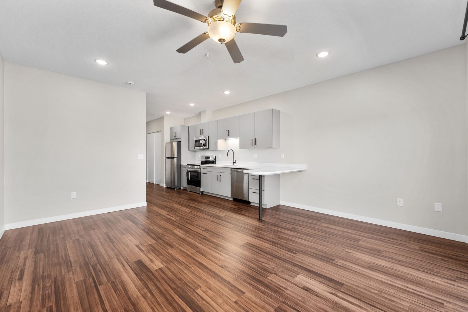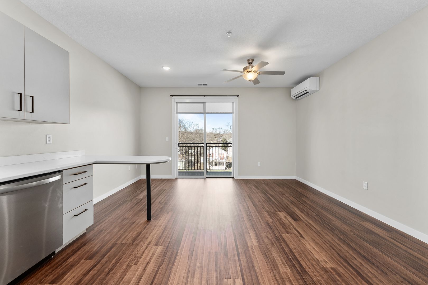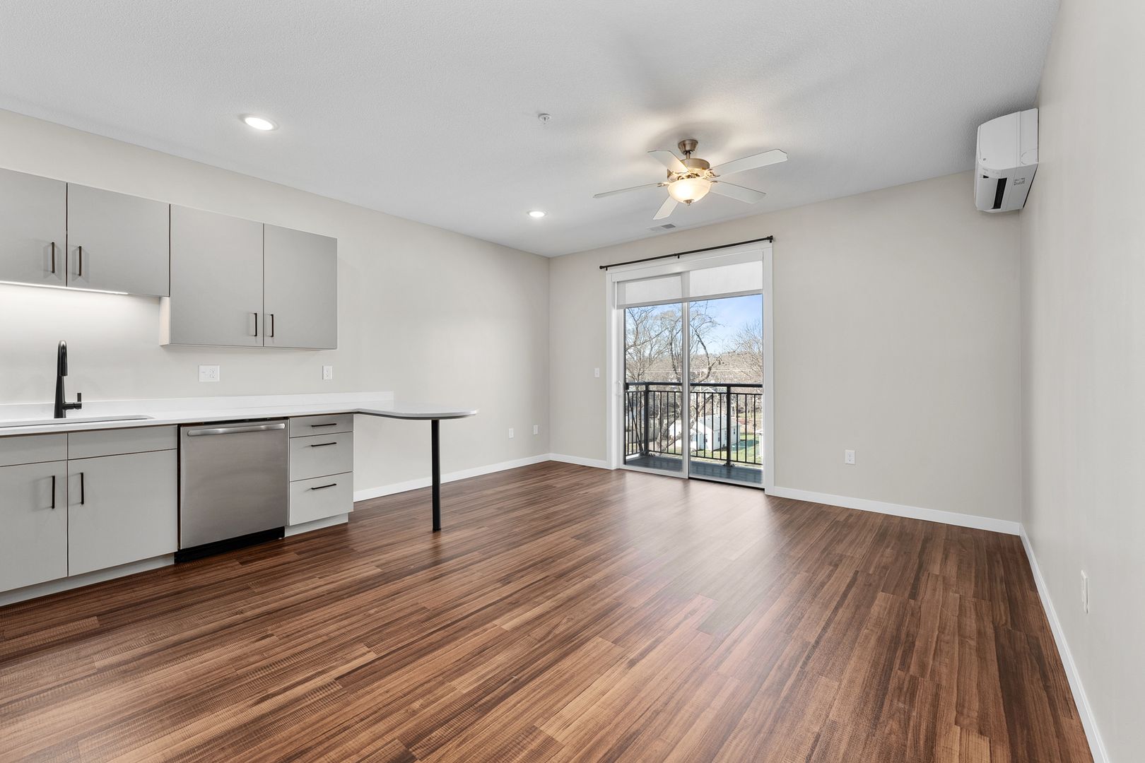 This studio apartment features a contemporary kitchen equipped with energy-efficient stainless-steel appliances, quartz countertops, and plenty of storage. The space is enhanced by laminate wood flooring, modern fixtures, a stackable washer and dryer, window coverings, a ceiling fan, a large closet, and a balcony.