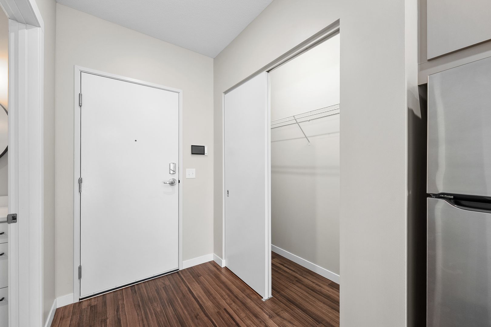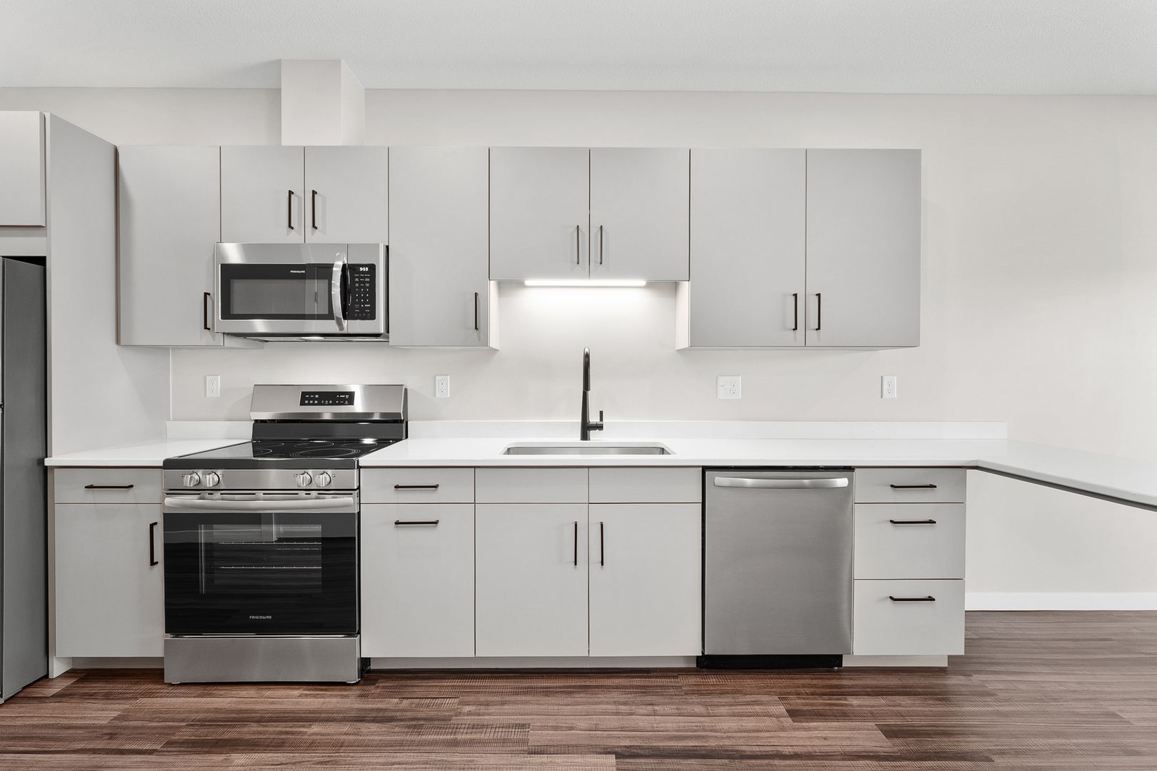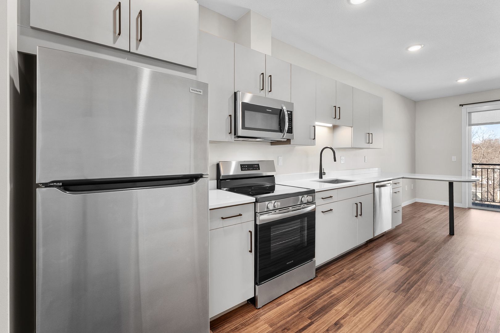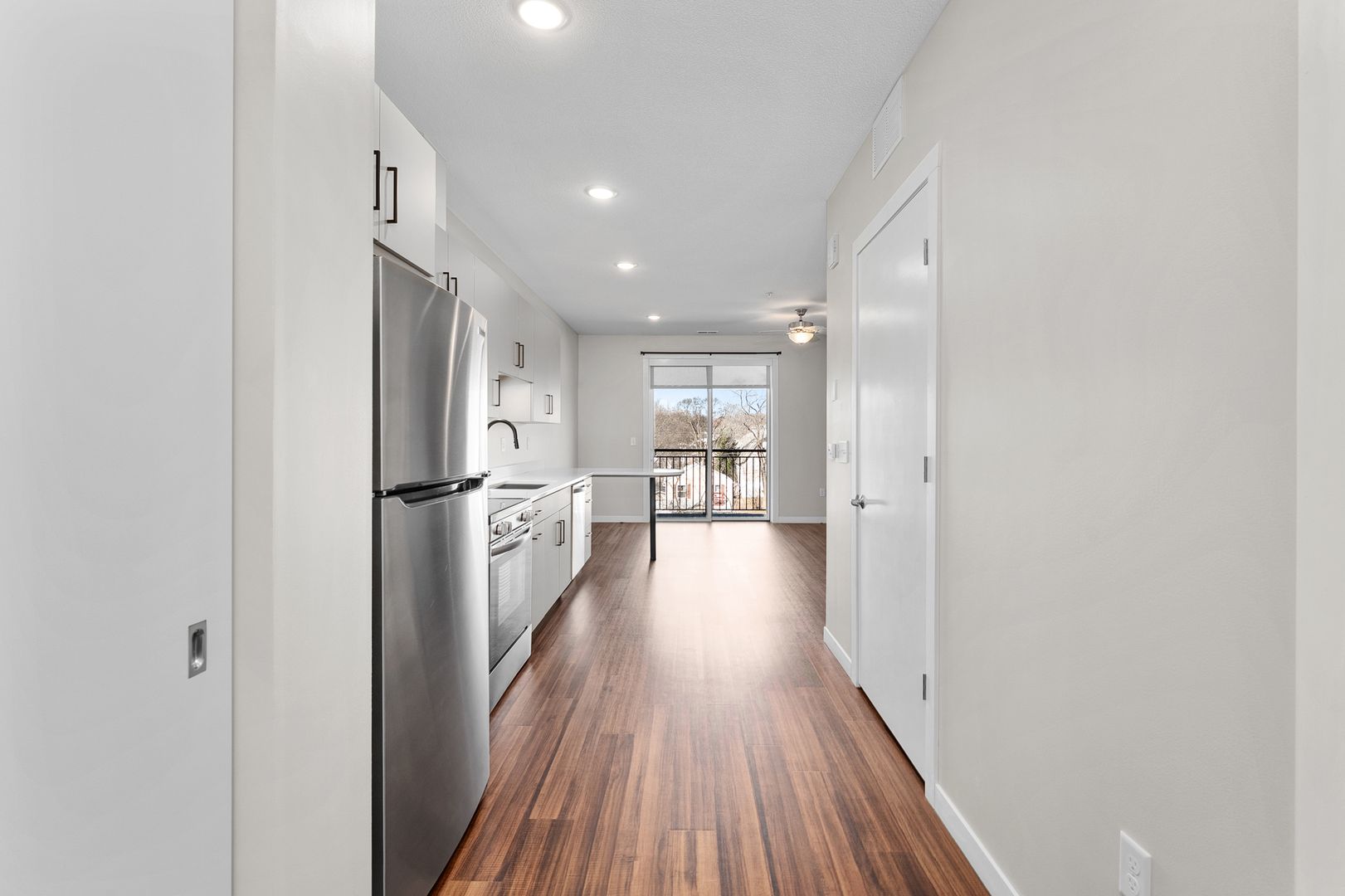 This studio apartment features a contemporary kitchen equipped with energy-efficient stainless-steel appliances, quartz countertops, and plenty of storage. The space is enhanced by laminate wood flooring, modern fixtures, a stackable washer and dryer, window coverings, a ceiling fan, a large closet, and a balcony.